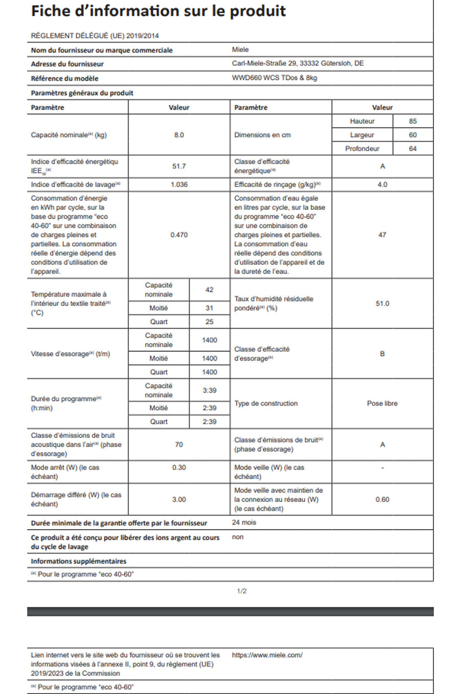 Caractéristiques techniques du MIELE WWD 660 WCS